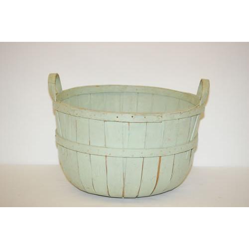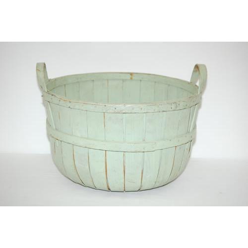 19TH CENT. PAINTED SPLINT GATHERING BASKET W/ DOUBLE HANDLES & WOODEN BASE IN APPLE GREEN PAINT (13 1/2" T X 19 1/4" W) - WEAR, SMALL LOSSES, IMPERFECTIONS