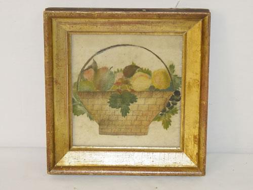 19TH CENT. PAINTED THEOREM ON VELVET OF BASKET OF FRUIT IN LEMON GOLD FRAME (6 1/2" X 6") - CUT DOWN, SPOTTING & LOSSES