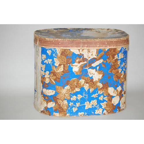 19TH CENT. PAPER BAND BOX - OVAL WALLPAPER COVERED BAND BOX LINED W/ EARLY GERMAN NEWSPAPER W/ 1850'S - 1860'S AMERICAN NEWSPAPER OVER GERMAN (15" T X 18.5" L W/ STITCHED SEAMS)-STAINING, LOSSES & WEAR TO OUTSIDE COVERING, SPLITS, IMPERFECTIONS