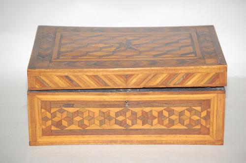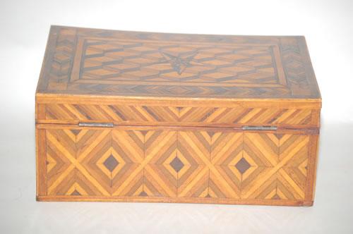 19TH CENT. PARQUETRY INLAID DOCUMENT BOX - BOX W/ EXOTIC WOOD INLAY OF BLOCKS, STARS & CHEVRONS (5 1/2" T X 12 1/2" L X 8 1/4" W) - LID WARPED, LOSSES & REPAIRS, IMPERFECTIONS