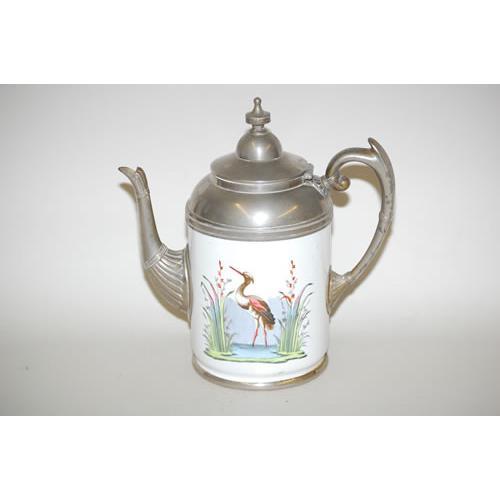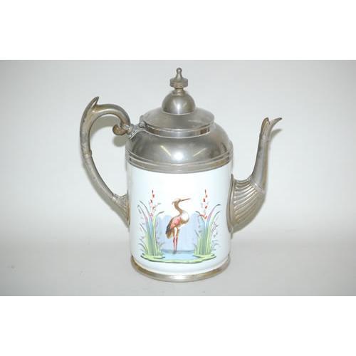 19TH CENT. PEWTER ENAMEL COFFEE POT - 19TH CENT. MOLDED PEWTER COFFEE POT W/ POLYCHROME ENAMELED BODY CANISTER W/ STORK & REED DECORATION (10" T X 9" W) - WEAR, ENAMEL CRACKS & LOSSES INSIDE POT, IMPERFECTIONS