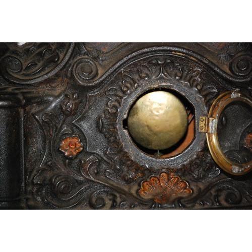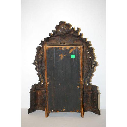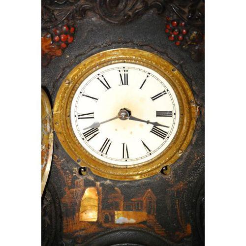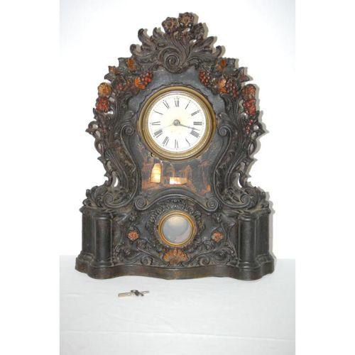 19TH CENT. PIERCED IRON FACED 8-DAY SHELF CLOCK W/ FLORAL PAINTED DECORATIONS & MOTHER OF PEARL INLAID LANDSCAPE (20" T X 15" W X 4 1/2" D) - WEAR, REPAIRS, REPLACEMENTS, IMPERFECTIONS