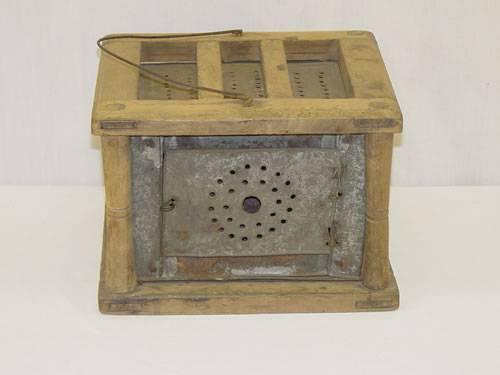 19TH CENT. PIERCED TIN FOOT WARMER IN A WOODEN FRAME W/ A WIRE BAIL HANDLE;
