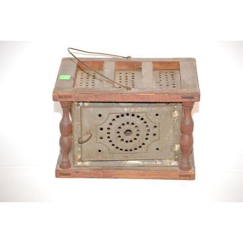 19TH CENT. PIERCED TIN FOOTWARMER IN A WOODEN FRAME W/ TURNED POSTS-MATCHING TIN PANELS W/ GEOMETRIC DESIGNS, HAS BAIL HANDLE & EMBER TRAY (5 3/4" T X 9" W X 7 3/4" D) - WEAR, IMPERFECTIONS