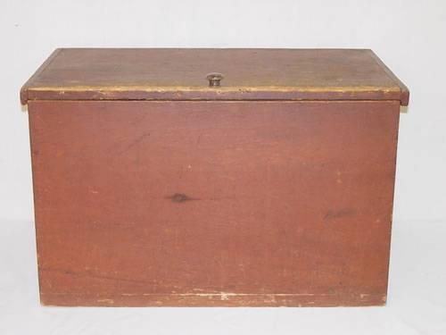 19TH CENT. PINE LIFT TOP STORAGE BOX IN OLD RED WASH - WEAR & IMPERFECTIONS;