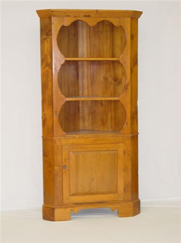 19TH CENT. PINE OPEN TOP SCALLOPED CORNER CUPBOARD W/ 3 SHELVES OVER RAISED PANEL DOOR BELOW W/ BRACKET BASE (APPROX. 39" W X 25" SIDES X 79 1/2" H) - REFINISHED, REPAIRS & IMPERFECTIONS