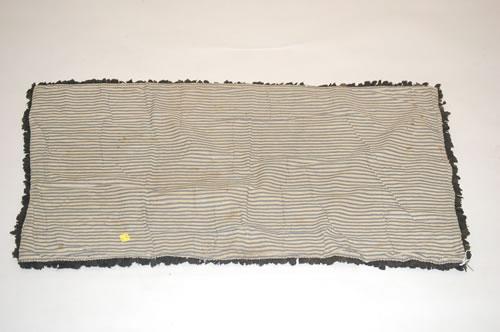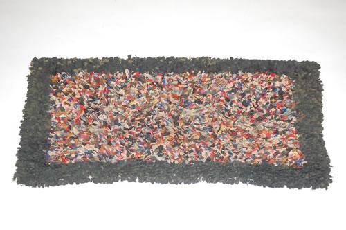 19TH CENT. RAG RUG - 19TH CENT. FOLKY HANDMADE SHAKER STYLE RAG SCATTER RUG W/ RANDOM POLYCHROME PIECED RAG CENTER PANEL & BLACK BORDER W/ MATTRESS TICKING BACKING (1FT. 11" X 2 FT. 11") - WEAR, SOILING, IMPERFECTIONS