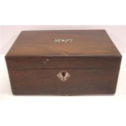 19TH CENTURY ROSEWOOD JEWELRY BOX. Mother of pearl inlaid decoration at top and at lock. Shows signs of wear throughout. Bottom is split. 4.25” H, 10” W, 7” D