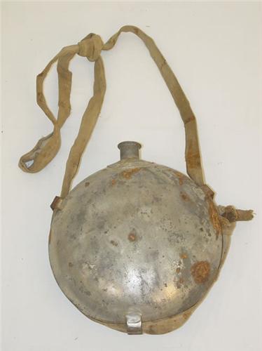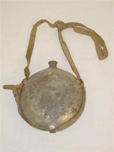 19TH CENT. ROUND MILITARY TIN CANTEEN W/ APPLIED TIN NECK, SHOULDER & STRAP ATTACHMENTS W/ KNOTTED & TIED FABRIC STRAP (9" X 8") - DENTS, RUST, IMPERFECTIONS