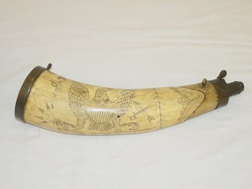 19TH CENT. SCRIMMED POWDER HORN W/ 2 AMERICAN SHIELD EAGLES-1 W/ INITIALS & UNION BANNER, ALSO DEPICTING SMALL & LONG ARMS, ARROWS, SWORD, ETC., W/ FITTED BRASS MEASURE & CAP (11" L) - WEAR, SMALL HOLE, IMPERFECTIONS