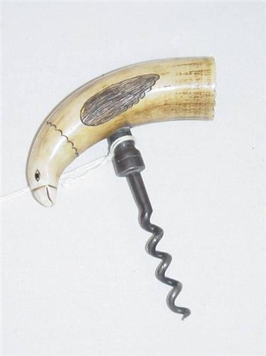 19TH CENT. SCRIMSHAWED WHALES TOOTH CORKSCREW IN THE FORM OF A BIRD "GREASY LUCK" - MINOR CHIP TO BIRDS BEAK;
