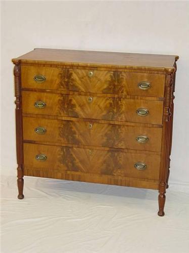 19TH CENT. SHERATON MAHOGANY GRADUATED 4 DRAWER CHEST HAVING 4 REEDED POSTS W/ PINEAPPLE CAPITALS, COOKIE CORNERS, FIGURED WOOD & VENEERS - WEAR & IMPERFECTIONS;
