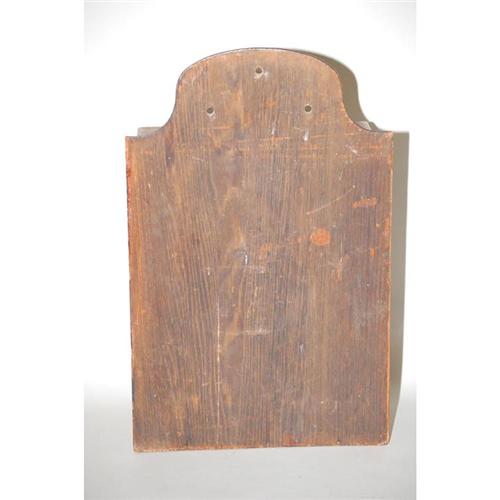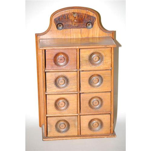 19TH CENT. SPICE CABINET - 8-DRAWER WOODEN HANGING SPICE CABINET W/ MOLDED BACKBOARD W/ CREST STENCILED "SPICE CABINET" & RECESSED CARVED KNOBS (17" T X 10 1/2" W) - 1 OLD DRAWER REPLACED, WEAR & IMPERFECTIONS