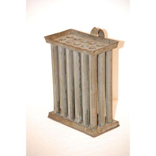 19TH CENT. TIN CANDLE MOLD FOR 18 CANDLES W/ SHAPED HANDLE (11" T X 8" W X 6" D) - WEAR, OXIDATION, HANDLE COMPRESSED, IMPERFECTIONS
