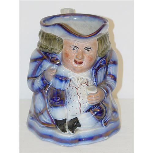 19TH CENT. TOBY JUG - FLOW BLUE & LUSTRE WARE DECORATION & TWIG FORM HANDLE (5 1/2" T X 6" W) - WEAR, GLAZE CRAZING, IMPERFECTIONS;
