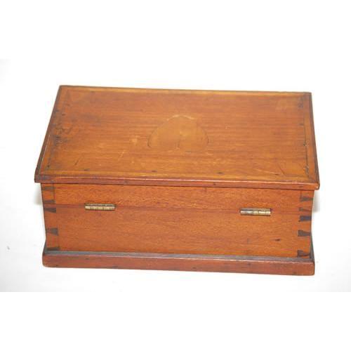 19TH CENT. TRAMP ART DOCUMENT BOX - DOVETAILED MAHOGANY W/ LINE INLAY & INLAID HEART & DIAMONDS & BRASS ESCUTCHEON (3 3/4" T X 9 1/4" W X 5 3/4" D) - WEAR, LOCK DAMAGE, IMPERFECTIONS