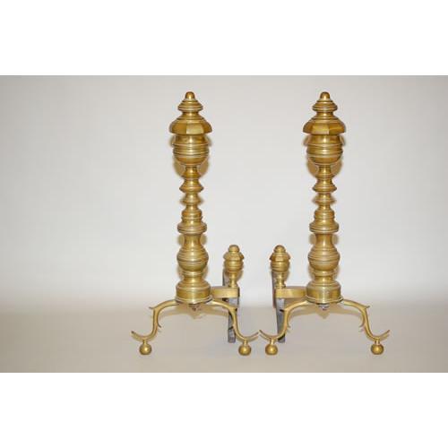 19TH CENT. TURNED BRASS ANDIRONS - PR. FANCY 19TH CENT. RING TURNED BRASS ANDIRONS W/ LARGE FINIAL TOPS & PAGODA BASES (21 1/2" T X 10 1/2" W X 18" L) - WEAR, MINOR IMPERFECTIONS
