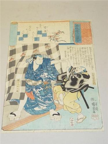 19TH CENT. UTAGAWA KUNIYOSHI JAPANESE WOODBLOCK PRINT- FROM THE TALE OF GENJI SERIES - TOKONATSU (EVERLASTING SUMMER) DANSHICHI KUROBEI, UNFRAMED (CIRCA 1845) (14 1/2" X 9 1/4") - WEAR, TONING, LIGHT INSECT DAMAGE & IMPERFECTIONS
