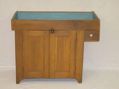 19TH CENT. WALNUT DRY SINK W/ BLUE PAINTED BASIN & SHELF INTERIOR (PROB. PA) - PAINT WEAR & IMPERFECTIONS;
