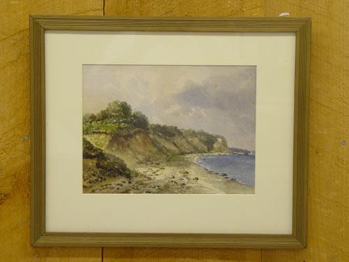 19TH CENT. WATERCOLOR BEACH LANDSCAPE TITLED EAST BANK ROBINSON ISLAND (?), SIGNED SBD 1886 (NOT EXAMINED OUT OF FRAME) (8 3/4" X 11 1/2"-SIGHT) - MINOR FOXING & TONING;