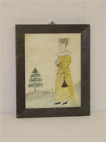 19TH CENT. WATERCOLOR ON PAPER OF GIRL W/ YELLOW DRESS HOLDING A FLOWER W/ LANDSCAPE BACKGROUND, UNSIGNED (8 3/4" X 6 3/4") - MINOR WATER DAMAGE & TONING;