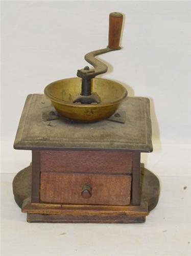 19TH CENT. WOODEN TABLE TOP COFFEE MILL W/ BRASS HOPPER & IRON CRANK - WEAR & IMPERFECTIONS, BASE DETACHED