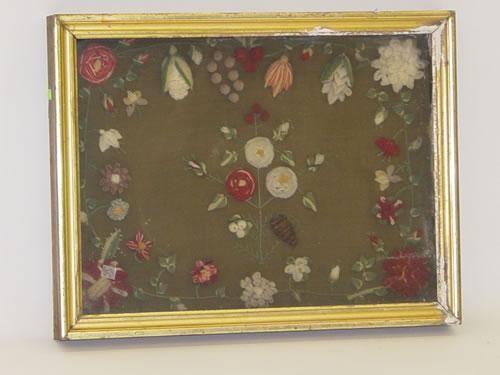 19TH CENT. WOOL WORK EMBROIDERY PICTURE OF FLOWERS W/ FRUIT, CORN, PINECONE, ETC. RAISED DECORATIONS W/ WOOL LOOPS & CHENILE ETC. ON GREEN CLOTH BACKGROUND IN GILT SHADOW BOX FRAME (17 1/4" X 23 1/2") - LIGHT INSECT DAMAGE, DAMAGE TO FRAME, IMPERFECTIONS