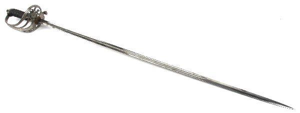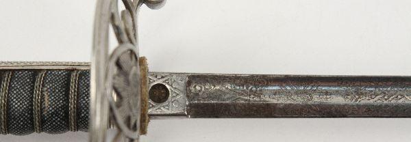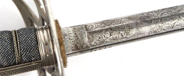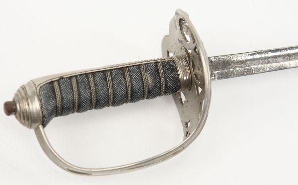 Victorian era British officer's sword of the Scots Guards. 32.5 inch straight blade, with single fuller, etched with floral scroll, royal arms, and regimental motto. Blade marked "SJ PILLIN MANUFACTURER GERRARD'S SOHO LONDON" on ricasso, with inset proof obverse. Plated hilt, with Scots Guard badge inset on knuckle guard. Wire wrapped shargreen grip. Blade is very good, hilt has minor losses to plating on guard, but otherwise very good. No scabbard. Overall very good condition. With copy of COA.