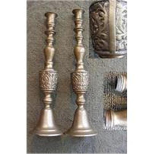 THESE OLD CANDLESTICKS HAVE A VERY INTERESTING STORY BEHIND THEM. MY GREAT UNCLE HORNER WAS GOOD FRIENDS WITH ESTEE LAUDER (OF THE COSMETIC LINE). ESTEE INTRODUCED UNCLE HORNER TO THE PRINCE OF INDIA DURING WHAT I BELIEVE WAS A CHICAGO SYMPHONY ORCHESTRA EVENT IN THE 1930'S. UNCLE HORNER WAS AN AMAZING OIL PAINTER SO THE PRINCE ASKED FOR A SITTING PORTRAIT THAT WAS TO BE PAINTED ON CANVAS AND FRAMED. IN RETURN, THE PRINCE GAVE MY UNCLE NUMEROUS GOODS FROM THE FAR EAST. UNCLE HORNER DIED IN 1969 AND THE ITEMS RECEIVED FROM THE PRINCE WERE DIVIDED UP WITHIN THE FAMILY. THE CANDLESTICKS STAND OVER 17" TALL AND WEIGH 5 POUNDS. AS YOU CAN SEE THEY ARE HANDMADE AND ONE IS ACTUALLY A LITTLE TALLER THAN THE OTHER. I HATE TO PART WITH THEM BUT I HAVE RE-DECORATED AND THEY DON'T FIT IN WITH THE STYLE I HAVE CHOSEN. PLEASE FEEL FREE TO ASK ANY QUESTIONS.