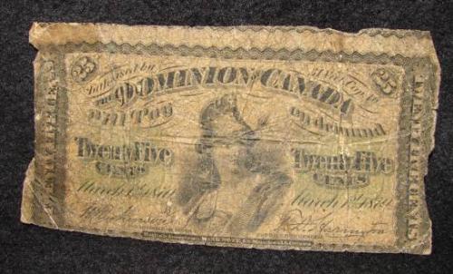 19TH CENTURY CANADIAN FRACTIONAL CURRENCY NOTE. 25 cents. From the Dominion of Canada.