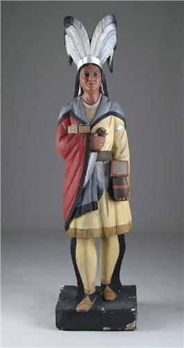 19TH CENTURY CARVED AND PAINTED CIGAR STORE INDIAN. Standing in striding position holding cigars in one hand and large knife in other. Standing on a square block and wearing a colorful dress in red, yellow and gray. A large feathered head dress adorns the head. PROVENANCE: De-accessioned from the Denver Art Museum in 1995. SIZE: 78” h with base; base being 6” h. CONDITION: Repainted, some weathering and cracks throughout and some minor repairs. Generally in very good condition. The base has chipping and cracks. 9-27701