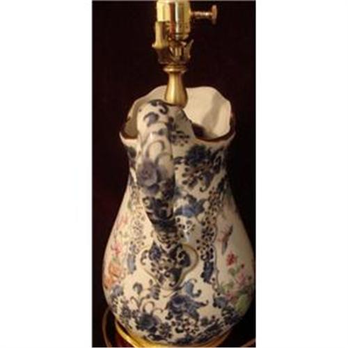 Late 19TH Century Chinese Export Mandarin Water Multi-Colored Pitcher with handle converted into a lamp. 11" In Height from Rosewood Base to mouth or top of handle of this fine water pitcher. Electrified. Good Condition. No chips, cracks or restoration.