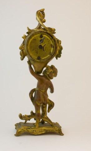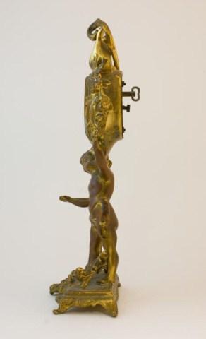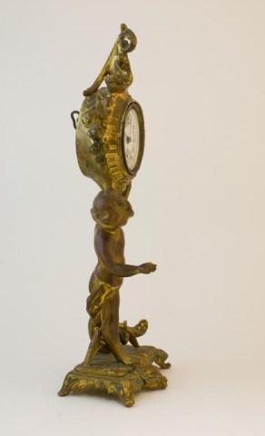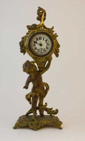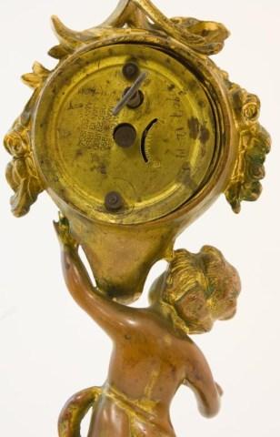 Last patent 1894. Clock with figure & stand approx. 11" tall. All original brass or white metal. Clock is in working condition.
