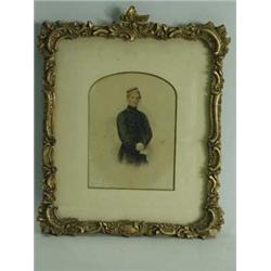 19TH CENTURY, ENGLISH SCHOOLA 3/4 LENGTH PORTRAIT OF AN ARMY OFFICERwatercolour, unsigned, mounted in a gesso frame. 7 1/2" x 5" (19 x 13cm) Est.100/150