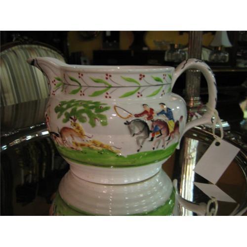 BEAUTIFUL ENGLISH 19TH CENTURY STAFFORDSHIRE HUNT SCENE PITCHER. IT IS ATTRACTIVELY DECORATED WITH A DIFFERENT SCENE ON EITHER SIDE AND VERY WELL EXECUTED. IT WAS MADE CA 1880 AND IS A VERY NICE PIECE TO ADD TO A COLLECTION WITH VERY GOOD DETAIL.