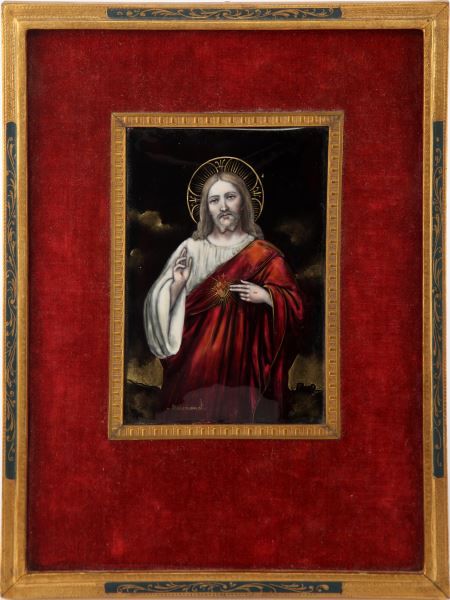 Portrait of Jesus Christ the Redeemer on bronze by Normand (Signed BL). Plaque image size is 3.5 by 5 inches. In gilt and velvet period frame. Overall size is 7.75 by 10 inches. Very good condition. Back of frame is marked with Parisian store information. This lot has a reserve
