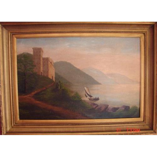 Late 19th Century Oil on Canvas Landscape Painting that very much reminds me of paintings from the Hudson River School of Artists. This well done painting is mounted in a nice gilded frame that measures 38" X 28". There is a boat with two people in it on a river or lake with mountains in the background. Also a path going up to what appears to be a castle type residence. The painting has had a restoration at one time that you can only tell by the restoration on the back of the painting patch. It is not relined.