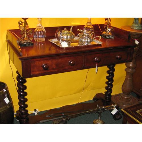 A LOVELY MAHOGANY 2 DRAWER ENGLISH SERVER WITH UNUSUAL BARLEY TWIST LEGS AND AN UNDERSHELF CONNECTING TO THEM. THE GALLERIED TOP IS STRAIGHT WITH SHAPED SIDES. THE SERVER IS A GREAT SIZE TO HAVE AS AN ADDITONAL SERVING AREA IN THE DINING ROOM. THIS SERVER WOULD ALSO FIT IN AN ENTRY HALL OR A PASSAGE DUE TO ITS COMPACT SIZE. IT WAS MADE CA 1880.