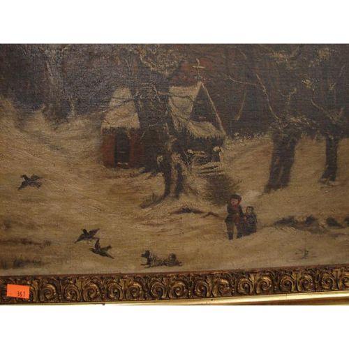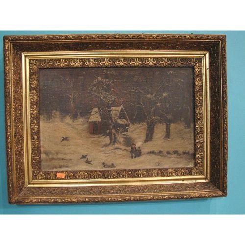19TH CENTURY LANDSCAPE OIL PAINTING. Oil on board. Depicts a winter forest scene with cabin. Mounted in gilt wood & gesso frame. Unsigned. Reverse of board is stamped “Russell’s/Canvas Board”. 18” x 24” framed. 12” x 18”.