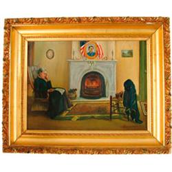 19TH CENTURY OOC CIVIL WAR DEPICTING THE EMPTY CHAIR. Painting signed indistinctly Bessie Masterton, June 1884 (?). The grieving widow or mother sits in a chair by the hearth, a letter in her hand. The opposite chair with Union cavalryman’s jacket, hat, and saber, together with a box of letters. Over the fireplace is a portrait of the apparent deceased. SIZE: 15-1/2” wide x 11-1/2” high, (Canvas only). 21-1/2” wide x 17-1/2” high including frame. CONDITION: Gilt gesso frame has a couple of minor losses. Painting is reasonably bright and generally excellent condition. 3-30444