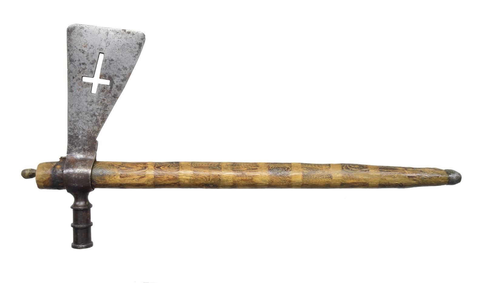 This classic pipe tomahawk has a head that measures 9 3/4" x 3 3/8”. The haft is 19 3/4". The iron head has a 3 ring 2” bowl & a 5” blade w/ a cross piercing. This style of tomahawk is typical of the Plains Indians. The haft is decorated w/ what appears to be file branding. There is a lead/pewter mouth piece at the lower tip. There is an early illegible tag attached to the haft near the head. CONDITION: blade has a medium, dark mottled patina & is free from damage. The haft has various scuffs & scrapes w/ no notable issues. Mouthpiece has a dark patina. (02-14010/BF). $1,800-2,800.