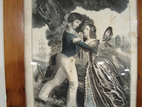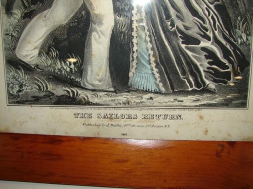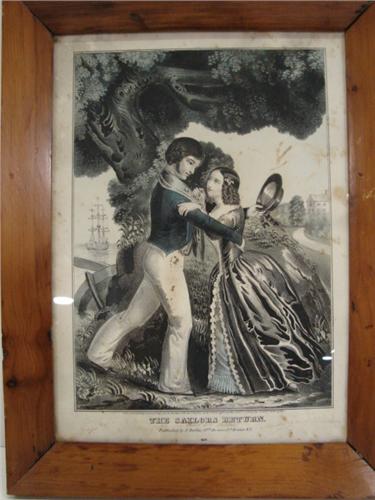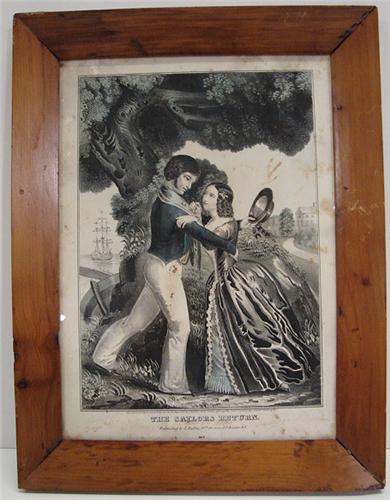 19TH CENTURY SAILOR PRINT. Titled "The Sailor's Return". Depicts a sailor returning home to his wife. Published by J. Baillie. In pine frame. Shows some soiling throughout. 12.75" x 16.75" framed.