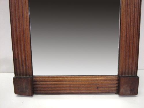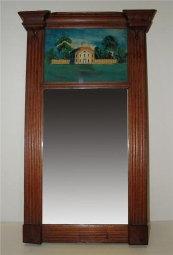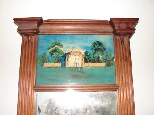 19TH CENTURY SHERATON MIRROR WITH REVERSE PAINTED TABLET OF HOUSE. Partial label on reverse for Wayne & Biddle, Philadelphia dealers in Looking Glasses. 23.5” H x 13.75” W.