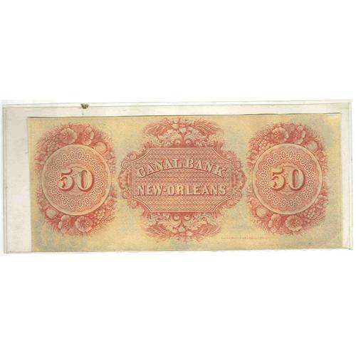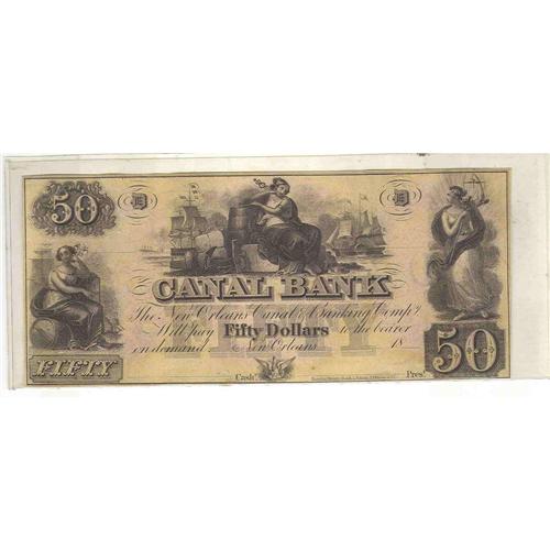 19TH c. UNCIRCULATED LOUISIANA $50 BANK NOTE. From the Canal Bank of New Orleans.