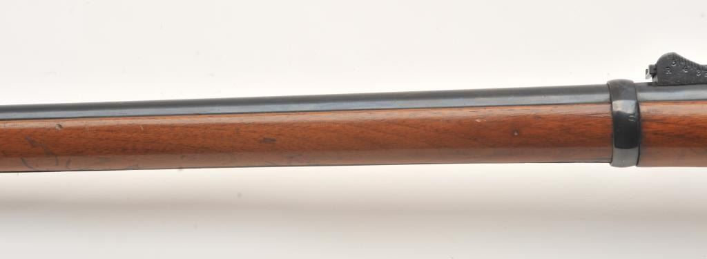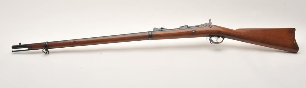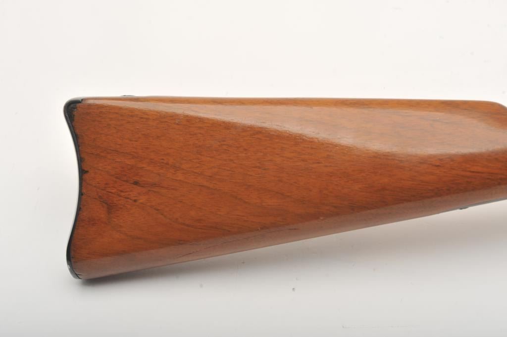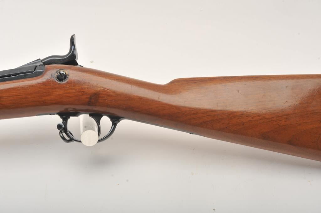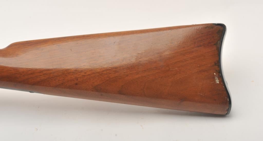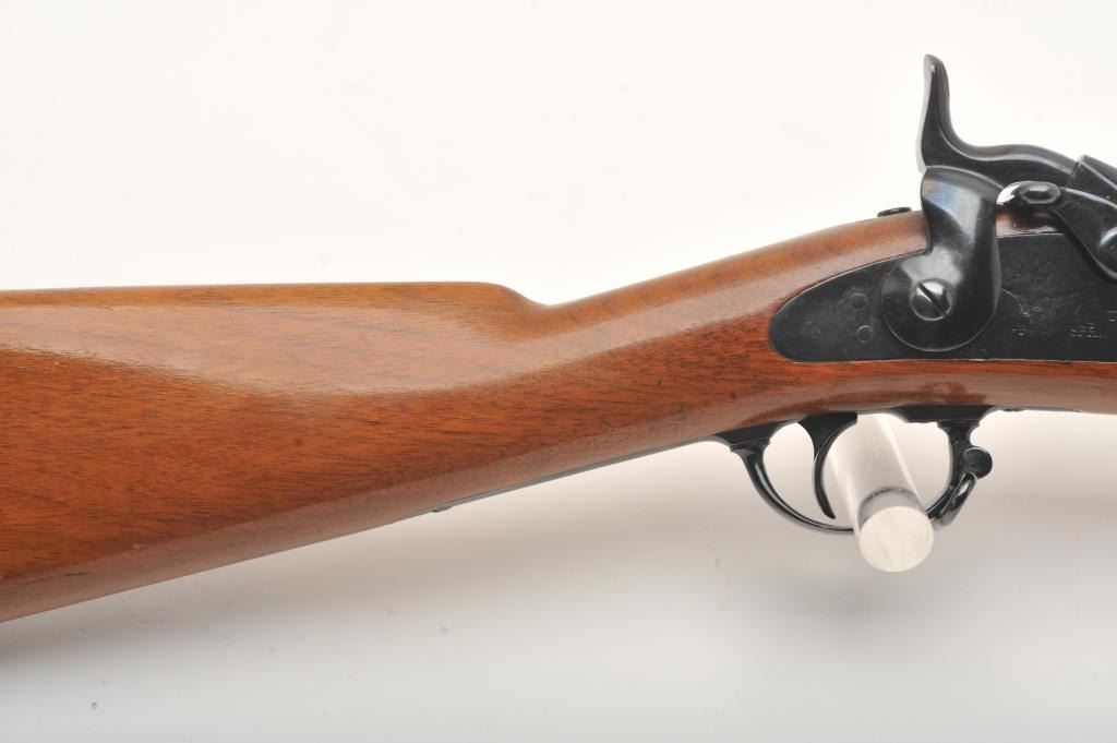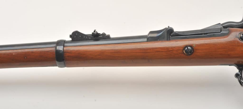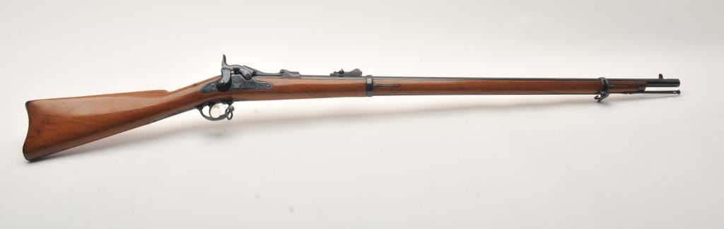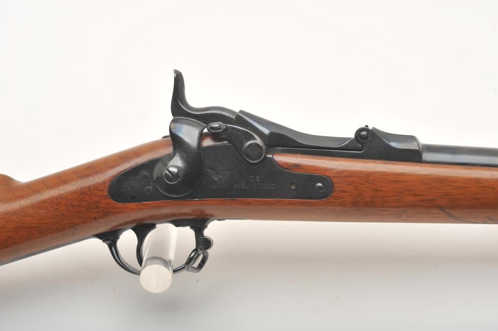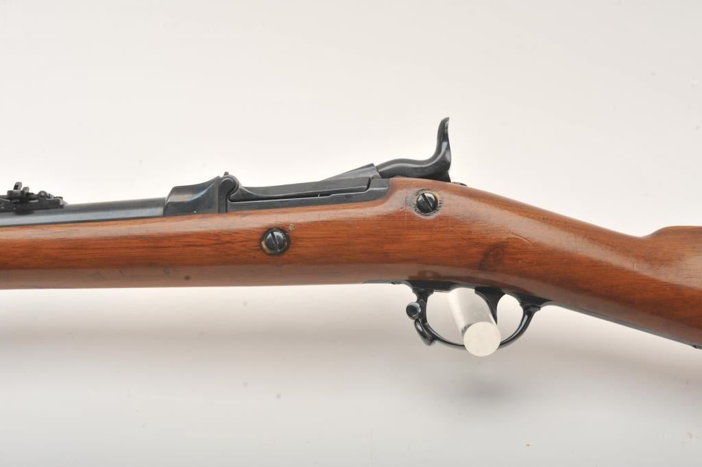 U.S. Springfield Trapdoor single shot rifle, .45-70 caliber, 32.5” barrel, re-blued finish, re-finished wood stock, S/N XX7469; overall good condition as re-finished, good bore, light markings, crisp action, good wood stock. (Antique). Est.: $250-$500.