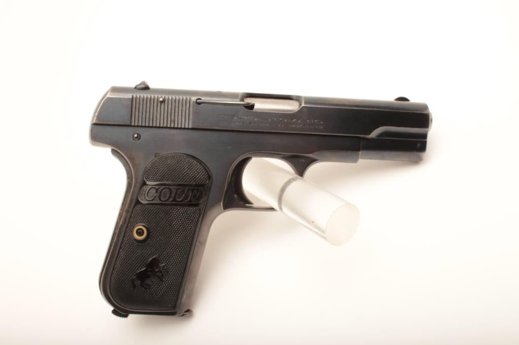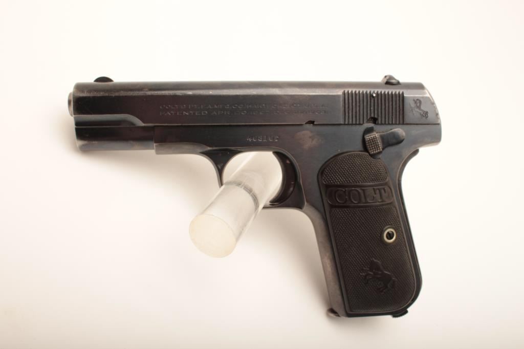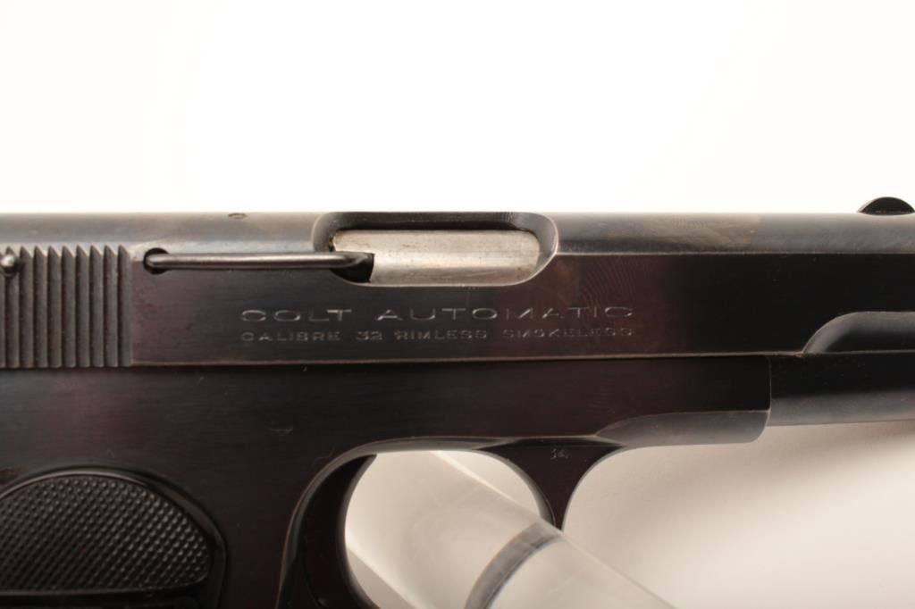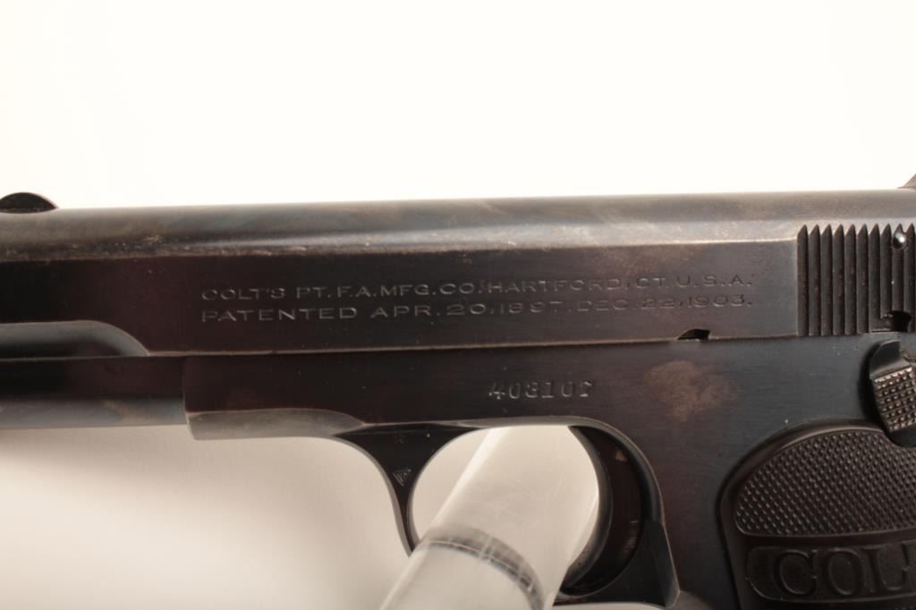 Colt Model 1903 Pocket Model semi-automatic pistol, .32 caliber, 3.75” barrel, blued finish, checkered hard rubber grips, S/N 403107; overall very good to fine condition showing majority of original finish with some minor muzzle and grip strap wear to finish; very good + bore, crisp action, sharp markings and fine grips. (C&R/PPT). Est.: $350-$700.