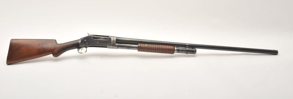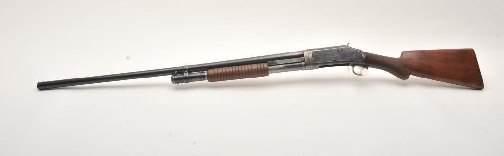 Winchester Model 1897 pump action takedown rifle, 12 gauge, 32” barrel, blued finish, wood stocks, S/N C 175055; overall good condition with considerable areas of original blued finish, good bore, crisp action, good markings and good wood stocks showing scattered mars and scratches from carry and storage plus hairline cracks (one on each side) at wrist area of butt stock. (C&R). Est.: $150-$300.