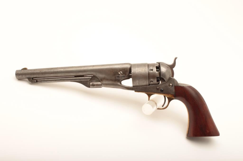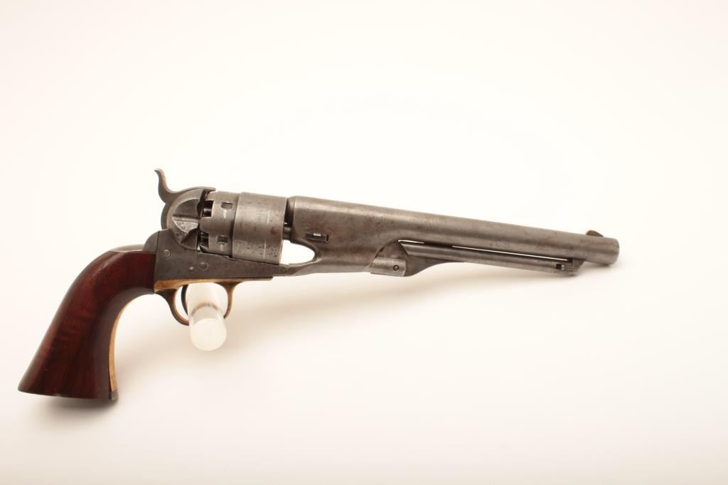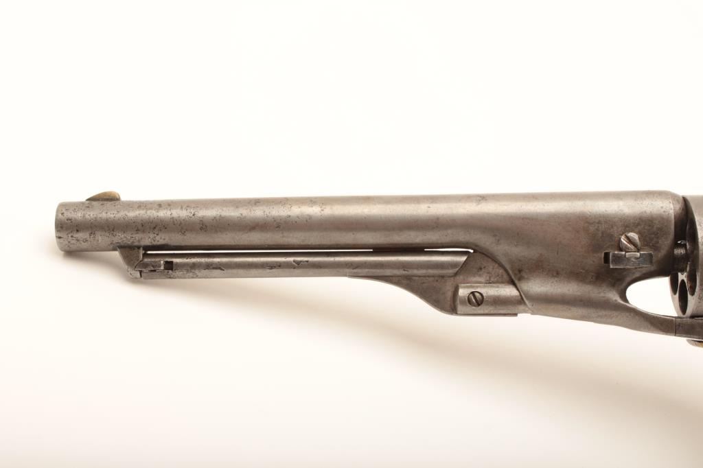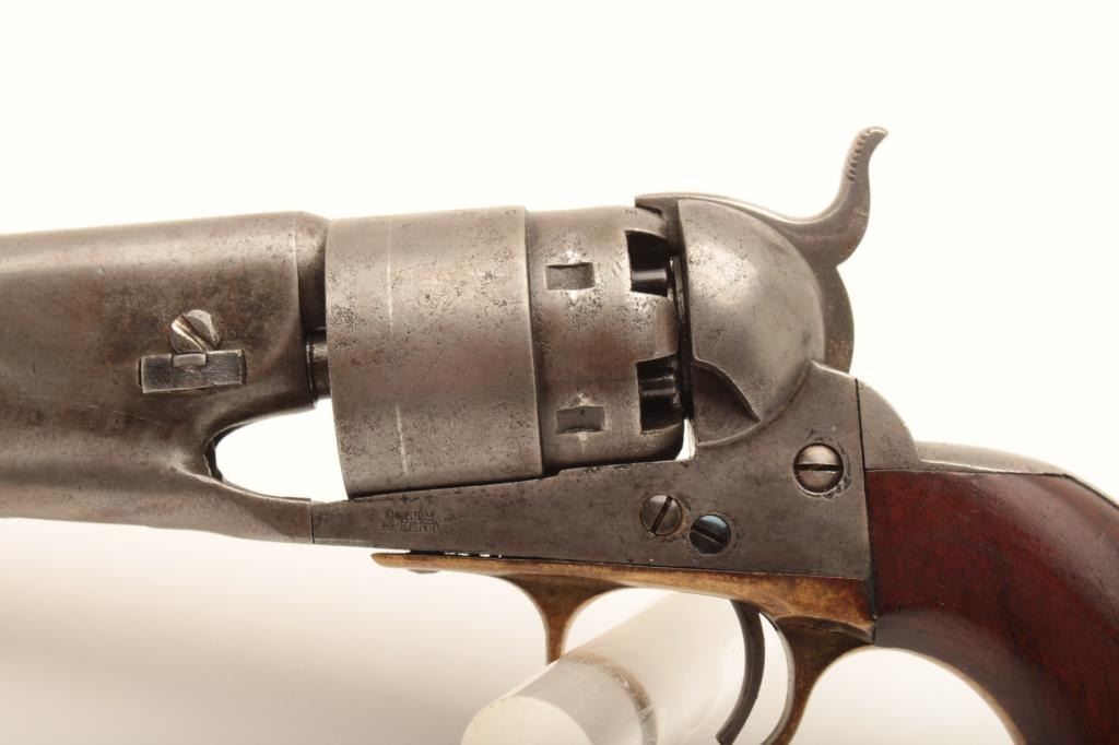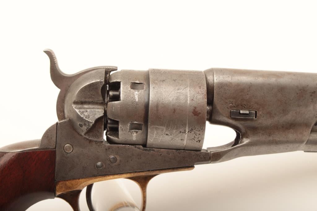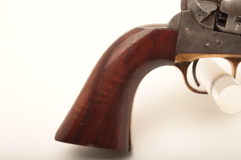 Colt Model 1860 Army percussion revolver, .44 caliber, 8” barrel, grey patina to metal surfaces, wood grips, cut for shoulder stock, iron backstrap; overall good condition with crisp action, approximately 30% cylinder scene and several scattered scratches on the cylinder; good grips. (Antique). Est.: $800-$1,600.