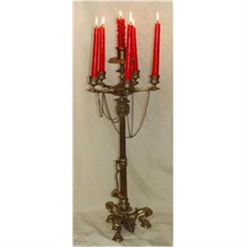 In high relief with a nice acanthus leaf adorned star pattern a fancy chain suspension 5 arms span complemented by the 6th central holder raised on a stylized classical column shaft the top accented with a somber lion mask, leading down to the snuffer hook and snuffer raised on a triple dragon claw feet with grotesque fanged cat knees and padded feet. This rare and unique Candelabra Centerpiece would make a super addition to any fine household or collection. ****NOTE: Email for larger and more images.