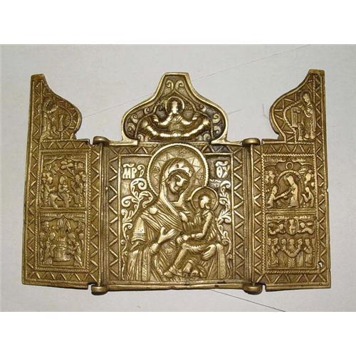 <tr><td>Title:19c Bronze Russian Orthodox Folding Icon</td></tr>